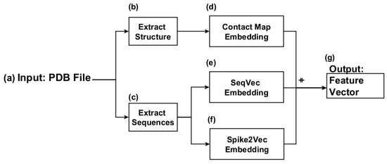 Figure 1 shows a high-level overview of the proposed approach. The PDB file is used as input to extract the sequences and structural information, as shown in Figure 1a–c. Using the structural information, we generate contact map-based embeddings, as shown in Figure 1d, whereas extracted sequences are used to generate LLM-based SeqVec embeddings and Spike2Vec embedding, as shown in Figure 1e,f. We evaluate these embeddings and their concatenated combinations to generate a feature vector to provide input for machine learning classifiers. Each step is discussed in detail below.