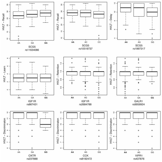 While 298 markers were below an α level of 0.05 in one phenotype or more, none of the markers in the loci of interest were significantly associated with verbal learning and memory after the multiple testing corrections (Supplementary Table S2). However, nine SNPs were found to be suggestively associated with HVLT-R phenotypes, with rs1997317 in the Secretogranin V gene (SCG5) approaching significance with the delayHVLT-R component (Table 3). Box plots showing the allelic distributions of the suggestive SNPs presented in Table 3 are illustrated in Figure 1.