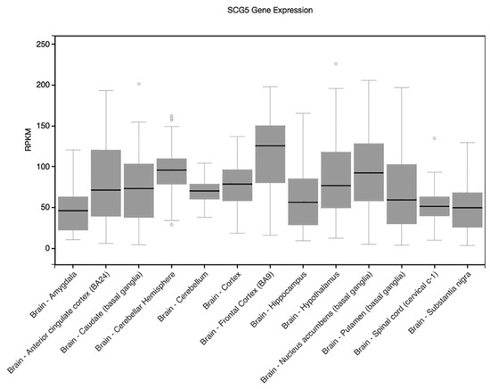 Genotype-Tissue Expression (GTEx) SCG5 gene expression illustrated across brain regions. (RPKM: reads per kilo base transcript per million). Circles represent values of outlier samples.