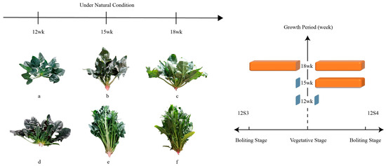 These seeds were sown at the end of December 2020 in a greenhouse at the Vegetable and Flower Research Institute. We counted three weeks as one stage and we randomly collected fresh leaves of 12S3 and 12S4 at the 4th, 5th, and 6th stages, corresponding to 12, 15, and 18 weeks, respectively, for Illumina sequencing (Figure 1). At each time point, we collected three replicates for each material. Bolting-susceptible material 12S4 bolted at the 5th stage (week 15), and bolting-tolerant material 12S3 bolted at the 6th stage (week 18). All samples were immediately frozen in liquid nitrogen and stored at −80 °C.