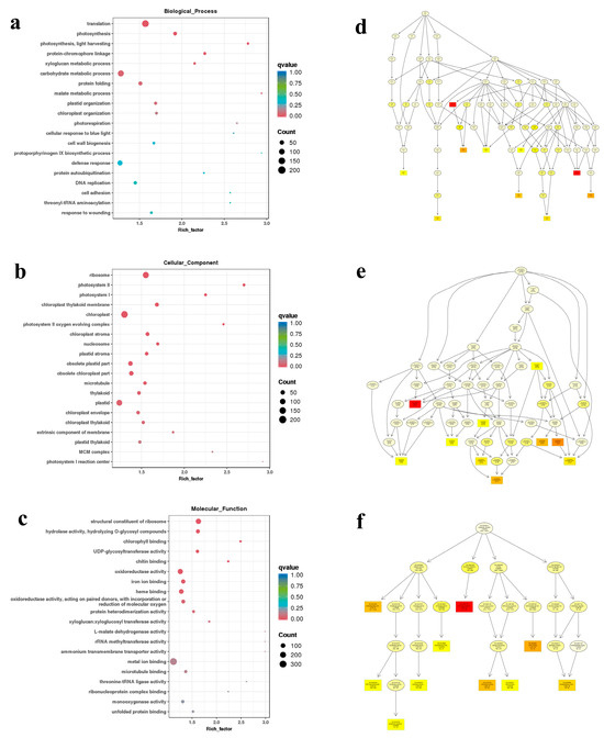 Top 20 pathways in the Gene Ontology (GO) enrichment analysis of DEGs in five comparisons. (a) GO enrichment dot plot on Biological_Processes; (b) GO enrichment dot plot on Cell_Components; (c) GO enrichment dot plot on Molecular_Function; (d) GO terms and hierarchical relationship on Biological_Processes; (e) GO terms and hierarchical relationship on Cell_Components; (f) GO terms and hierarchical relationship on Molecular_Function. Note: Each node represents a GO term, and the box represents the GO with an enrichment level of TOP 5. The depth of the box (or ellipse) color represents the enrichment level, and the darker the color, the higher the significance. The name of the term and the q-value of the enrichment analysis are displayed on each node.