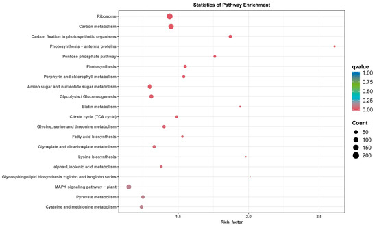 Enrichment analysis was conducted on the DEGs of these five comparative groups, and the enrichment significance of DEGs in GO nodes and KEGG metabolic pathways was obtained. In GO enrichment analysis, the three categories of biological processes with the highest degree of enrichment and difference were photosynthesis light harvesting, malate metabolic processes, and photorespiration. Abundant genes were related to translation, carbohydrate metabolic process, and photosynthesis. Among the top 20 pathways, six were directly related to photoperiod (including photosynthesis, chloroplast organization, and cell response to blue light) (Figure 4a). In the category of cellular components, the three items with the highest enrichment and difference were photosystem II, photosystem I, and photosystem II oxygen-evolving complex, and the three items with the highest number of genes were ribosome, chloroplast, and plastid. Most genes were associated with cell synthesis involved in photosynthesis (Figure 4b); in the molecular functional category, in addition to the structural constituent of ribosome, oxidoreductase activity, chlorophyll binding, and chitin binding all exhibited important enrichment differences (Figure 4c).