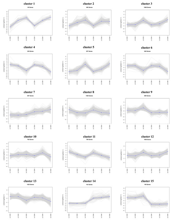 K-means clustering analysis was performed on all DEGs across six groups from three periods with two materials. Based on their dynamic expression, each co-expression gene was classified into 15 clusters (Figure 7). The light grey background color represents the expression of each gene in the cluster, and the blue line in the foreground represents the trend of dynamic expression in all genes in the cluster after fitting the sample data.