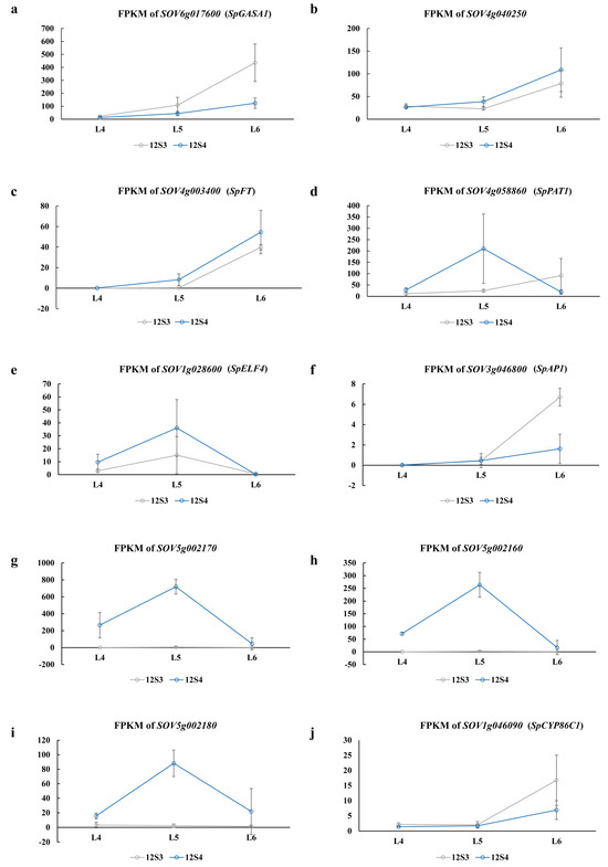 Changes in the expression of related genes at different bolting stages, using fragments per kilobase of exon model per million mapped fragments (FPKM) value as the standard for expressing changes in quantity. (a) FPKM of SOV6g017600; (b) FPKM of SOV4g040250; (c) FPKM of SOV4g003400; (d) FPKM of SOV4g058860; (e) FPKM of SOV1g028600; (f) FPKM of SOV3g046800; (g) FPKM of SOV5g002170; (h) FPKM of SOV5g002160; (i) FPKM of SOV5g002180; (j) FPKM of SOV1g046090.