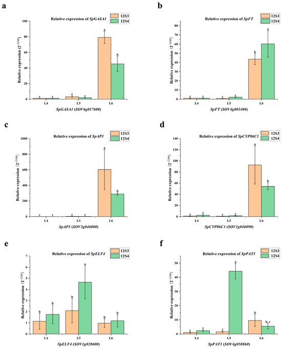 qRT-PCR was performed using six major hub genes. Values with the same letter were not significantly different at p < 0.05. (a) Relative expression of SpGASA1; (b) relative expression of SpFT; (c) relative expression of SpAP1; (d) relative expression of SpCYP86C1; (e) relative expression of SpELF4; (f) relative expression of SpPAT1.