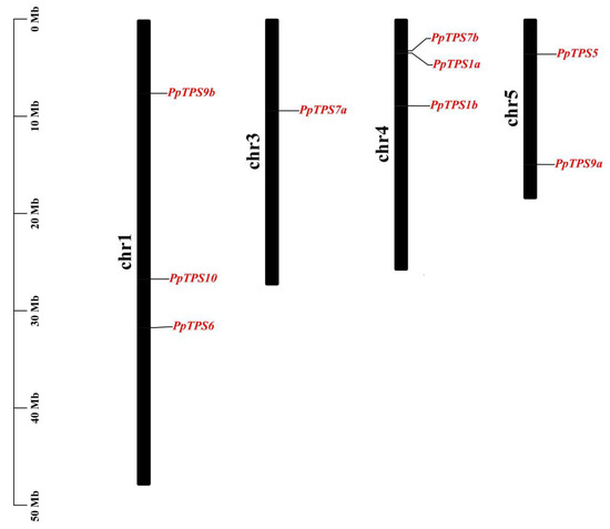 To identify TPS genes, TPS and TPP domains were both considered using HMMER (v3.1). According to the TPS genes in Arabidopsis and tomato [36], nine TPS genes were identified in the peach genome. There were two TPS classes in Arabidopsis, including TPS1–4 in class I and TPS5–11 in class II [37]. Following the gene name in Arabidopsis, we named these nine TPS genes as PpTPS1a, PpTPS1b, PpTPS5, PpTPS6, PpTPS7a, PpTPS7b, PpTPS9a, PpTPS9b, and PpTPS10. PpTPS genes were irregularly distributed across four chromosomes. Among them, PpTPS6, PpTPS9b, and PpTPS10 genes were distributed on Chr.1, PpTPS7a was distributed on Chr.3, PpTPS1a, PpTPS1b, and PpTPS7b were distributed on Chr.4, and PpTPS1b and PpTPS7b were found to be close to each other. PpTPS5 and PpTPS9a are distributed on Chr.5 (Figure 1).