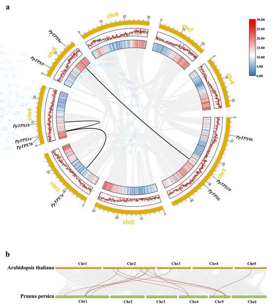 Collinearity analysis. (a) Collinearity analysis of TPS genes in peach. (b) Collinearity analysis of TPS genes in peach and Arabidopsis.