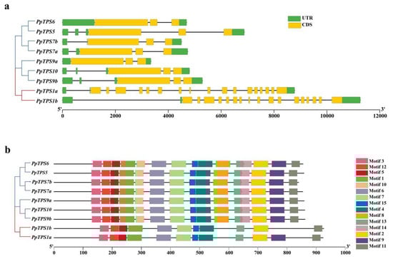 Gene structure and conserved motif analysis of PpTPS genes. (a) Gene structure of PpTPS gene. (b) Distribution of conserved motifs in PpTPS proteins.