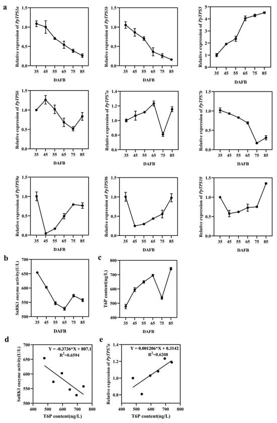 (a) Relative expression levels of PpTPS gene during fruit development. (b) Determination of T6P contents during fruit development. (c) SnRK1 activity during fruit development. (d) Correlation analysis between T6P content and SnRK1 activity. (e) Correlation analysis between PpTPS7a expression and T6P contents. Note: DAFB means number of days since flowering.
