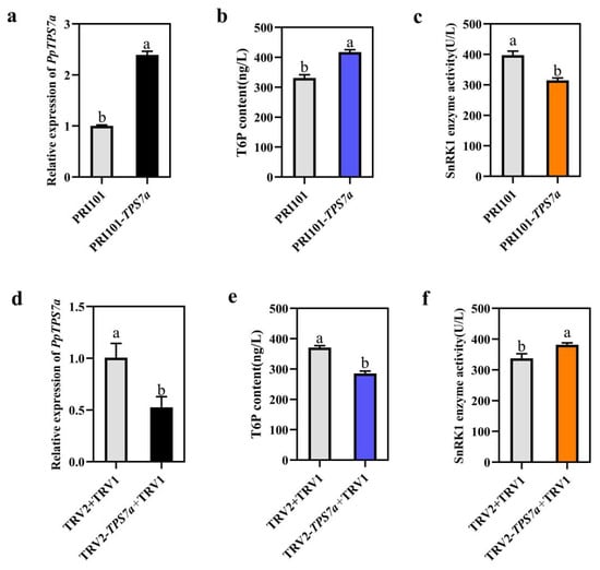 To validate the function of PpTPS7a, transient overexpression and gene silencing were performed in peach fruit. Overexpression of the PpTPS7a gene could significantly increase the T6P content (Figure 8a,b). while silencing PpTPS7a resulted in a decrease in T6P (Figure 8d,e). In addition, the enzyme activity of SnRK1 was also affected in transient expression fruit, showing decreased activity in overexpression fruit and increased silencing (Figure 8c,f). In conclusion, the PpTPS7a gene was mainly expressed in fruits and played a function in T6P synthesis during peach fruit development, which further regulated SnRK1 protein kinase activity.