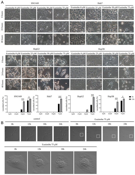 Ezetimibe treatment induces massive cytoplasmic vacuolation. (A) HCC cells were treated with Ezetimibe ranging from 0 to 75 μM for 8–24 h. Perinuclear vacuoles were observed in HCC cells with 50 μM Ezetimibe at the 8th hour and massive vacuoles in HCC cells with 75 μM Ezetimibe at the 24th hour using a 20× objective. Quantification of vacuolated cells. * p < 0.05, *** p < 0.001. (B) SNU-449 cells treated with or without Ezetimibe (75 μM) for 24 h were examined by live cell imaging. Scale bars, 50 μm. The cells were magnified.