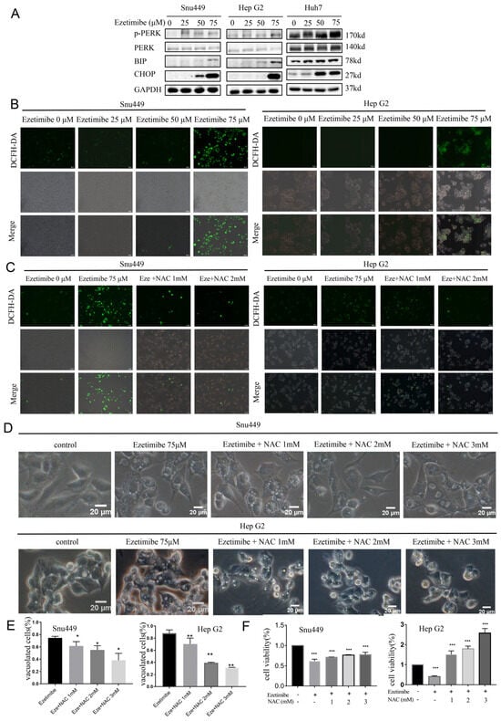 The accumulation of reactive oxygen species (ROS) has been reported to induce ER stress and lead to paraptosis [25,26]. To investigate whether Ezetimibe can induce ROS accumulation in HCC cells, ROS levels were assessed in HCC cell lines treated with Ezetimibe using a previously reported method [27,28]. SNU-449, HepG2, and Huh7 cells were treated with Ezetimibe (0 to 75 μM). As depicted in Figure 4B and Figure S2, Ezetimibe treatment resulted in a dose-dependent increase in ROS levels (green fluorescence). The accumulation of ROS was diminished by treatment with the general antioxidant N-acetylcysteine (NAC) at concentrations of 1 or 2 mM in SNU-449 and HepG2 cells (Figure 4C). Importantly, the Ezetimibe-induced cytoplasmic vacuolation and cell death could be dose-dependently prevented by treatment with NAC in SNU-449 and HepG2 cells (Figure 4D,E). Furthermore, the cell viability of HepG2 cells treated with NAC at a concentration of 3 mM was higher than that of the control cells [29,30], and the inhibition of cell viability by Ezetimibe was gradually attenuated by NAC in a dose-dependent manner [31] (Figure 4F). Ezetimibe-induced paraptosis is strongly associated with ROS production. In conclusion, the treatment with Ezetimibe induces the generation of ROS, which in turn triggers ER stress and vacuolation, ultimately leading to paraptosis in HCC cells. This process can be prevented by the use of the general antioxidant NAC.