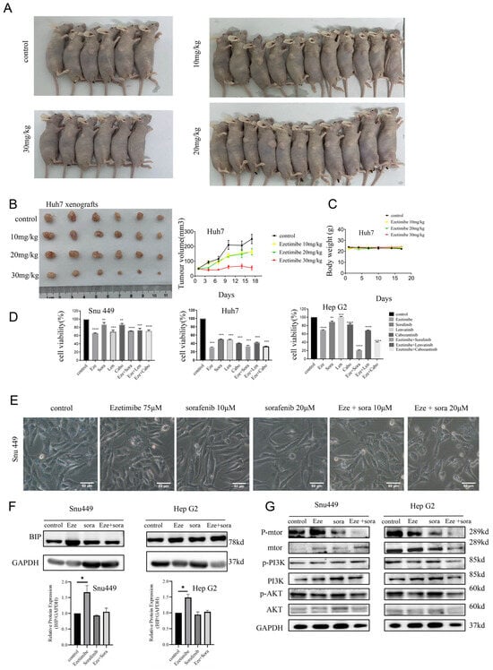 Ezetimibe inhibits tumor growth in mouse model. (A) After the experiment was completed, mice were euthanized. (B) The tumor volumes were measured once every 3 days, and growth curves of tumors are shown in photos of dissected tumors from the 4 mouse groups. (C) Curves of mouse body weight. (D) Cell viability was measured by CCK8 assay on HCC cells treated with Eze (Ezetimibe, 75 μM), Sora (Sorafenib, 10 μM), Len (Lenvatinib, 10 μM), Cabo (Cabozantinib, 10 μM), or combination of two agents. ** p < 0.01; *** p < 0.001; **** p < 0.0001. (E) Sorafenib had no impact on cytoplasmic vacuolization in SNU-449 cells. Scale bars, 50 μm. (F,G) The levels of proteins related to ER stress and PI3K/AKT/mTOR signaling were detected in HCC cells treated with Ezetimibe or/and Sorafenib, * p < 0.05.