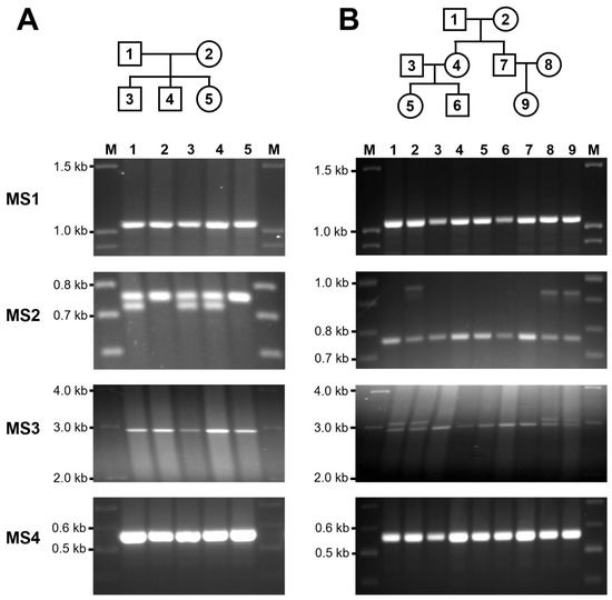 An analysis of the inheritance patterns of the VNTR regions in CLPTM1L was conducted using family groups comprising two and three generations (Figure 3). Genomic DNA samples previously obtained from each family member were utilized [18,19]. The confirmation of each VNTR region was performed in eight families. Meiotic transfer of all VNTRs was traced from parents to offspring, and hereditary segregation was observed in both two-generation (Figure 3A) and three-generation (Figure 3B) families. The segregation patterns within each family indicated that these VNTRs were transmitted through meiosis in accordance with Mendelian inheritance principles (i.e., each child inherited one VNTR allele from each parent; Figure 3).