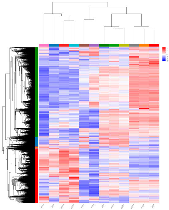 Transcriptome expression differences of four species of ducks (P, J, PJ and JP) at three time points were studied by RNA-seq. Total RNA was extracted from four kinds of duck breast muscle tissues at three time points, and 36 cDNA libraries (three time points in each group, three samples at each time point) were sequenced using the Illumina HiSeq platform. A total of 307.91 Gb of raw reads and 297.59 Gb of clean reads were obtained in this experiment. All of the raw sequence data have been deposited in the National Center for Biotechnology Information (NCBI) Sequence Read Archive (SRA) (https://www.ncbi.nlm.nih.gov/sra, accessed on 20 December 2023) under accession number PRJNA1056445. The clean reads of each sample after filtration were more than 6.26 Gb, with Q30 ≥ 94.39% and GC content ranging from 50.12% to 54.27%. Clean reads were compared separately to the duck genome, and the total mapped reads were between 60.76% and 76.6% (Table 1). The above results indicated that the three biological samples from each group at various periods presented similar high performance, the relevant experimental sampling procedures and experimental conditions met the requirements of sequencing and the results could be used for subsequent bioinformatics analysis. To thoroughly investigate the transcriptomic differences among groups and across different time points, DESeq2(v1.42.0) software was utilized. A significance threshold of p-adjust < 0.05 and |log2FC| ≥ 1 was applied. The hierarchical clustering method was used to compare the DEGs of different duck species at different periods (14, 21 and 28 days), and a gradual change in gene expression was observed (Figure 1). DEGs could be further classified on the left side of the hierarchical clustering gene tree, where the gene expression pattern was similar among groups at 28 days of embryonic stage, and the PJ and JP groups were closest. The J, PJ and JP gene expression patterns at the 14- and 21-day embryonic stage were similar overall, but the clustering of the 14- and 21-day embryonic stage was closer in Group P, indicating that the gene expression patterns at early embryonic development of Pekin ducks were significantly different from those of the other three breeds.