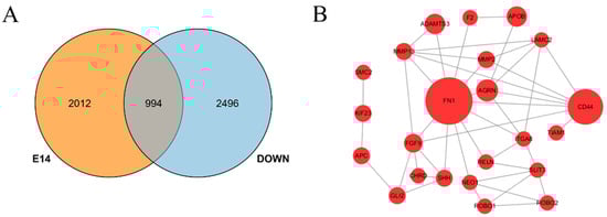 Differentially expressed genes (DEGs) in early development of duck embryos. (A) A Venn diagram showed the relationships among DEGs in day 14 and down-regulated DEGs in red module. (B) Interaction network diagram of intersection genes in A; only nodes with Degree ≥ 8 are displayed.