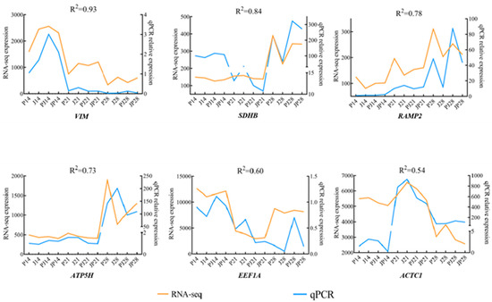Following RNA-seq analysis, six genes, including VIM, SDHB, RAMP2, ATP5H, EEF1A and ACTC16, were selected randomly for further validation with qRT–PCR. Primer information is shown in Table S9. qRT–PCR analysis data showed that most trends for the selected six genes corroborated the results from RNA-seq analysis. Among them, VIM had the highest correlation of 0.93, and ACTC1 had the lowest correlation of 0.54 (Figure 5). The above tests verified the accuracy and reliability of the RNA-seq analysis results.