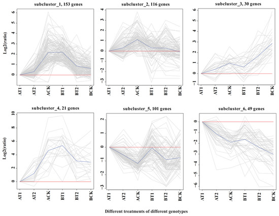 Cluster analysis of the common differentially expressed genes in ZQUA44 and ZQUB15. The ordinate is the value of the expression value after logarithmic centralization correction and the red lines indicate the value is zero. The blue lines represent the relative corrected gene expression levels of all genes in this cluster under different experimental conditions.