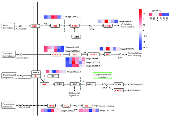 In total, 11 DEGs were identified as being involved in plant hormone signal transduction, including the signal transduction pathway of cytokinine, abscisic acid (ABA), brassinosteroid, and salicylic acid (Table 4, Figure 5). Half of them were enriched in the ABA signal transduction pathway, including two DEGs encoding PYR/PYL (ABA receptor), three encoding P2C (protein phosphatase 2C), and one encoding ABF (ABA-responsive element binding factor). The DEGs involved in plant hormone signal transduction had different expression patterns. For example, those encoding NPR1 (nonexpresser of pathogenesis-related genes), BKI1 (A leucine-rich repeat receptor serine/threonine kinase that could perceive brassinosteroids at the plasma membrane called BRI1, and the BRI1-interacting protein called BKI1), and PYR/PYL were all activated under nutrient deficiency in both genotypes, while those encoding AHP (histidine-containing phosphotransfer peotein, Eucgr.J00169.1, and Eucgr.G03093.1) and PP2C (Eucgr.J02003.1, Eucgr.C03732.1, and Eucgr.A02858.1) were activated under high nutrient levels in the high-growth ZQUA44 genotype but were inhibited under low nutrient levels in the low-growth ZQUB15 genotype. The DEGs encoding A-ARR (Eucgr.B03374.1) and ABF (Eucgr.F02337.3) were activated under high nutrient levels in ZQUA44, while there were no significant differences observed in ZQUB15.
