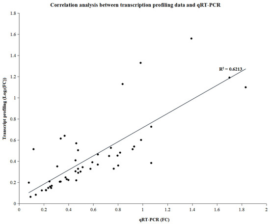 Ten genes with different expression patterns revealed by RNA sequencing were randomly selected for validation by reverse transcription quantitative real-time PCR (qRT-PCR). RNA extracted from leaves from all samples was used for qRT-PCR validation. cDNA was synthesized using a Tiangen FastKing RTKit (Tiangen Biotech). Gene-specific primers for qRT-PCR were designed based on the corresponding sequence on the NCBI Primer-BLAST (https://www.ncbi.nlm.nih.gov/tools/primer-blast/index.cgi?LINK_LOC, accessed on 27 August 2020) and are listed in Table S1. Actin (EF145577) was used as an internal control. The qRT-PCR was performed using the FastKing RT Kit and determined using an Applied Biosystems 7500 fast real-rime PCR system following the manufacturer’s instructions. Three technical replicates were performed for each gene. A regression analysis was performed between qRT-PCR and RNA sequencing, including all of the genes of the two genotypes at the three different treatments using the r package (version 3.1.3, http://cran.r-project.org/, accessed on 15 September 2020).