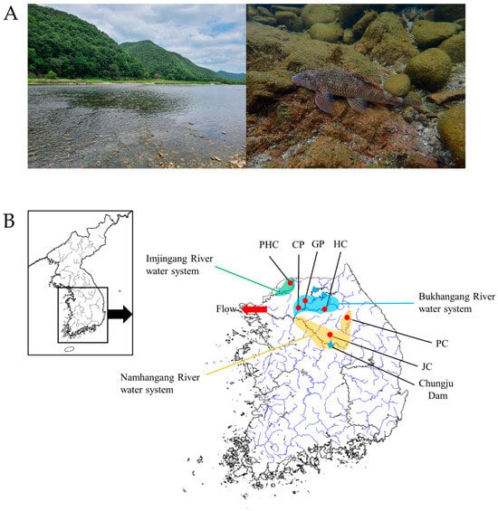 (A) Photo of M. longidorsalis and its habitat. (B) Sampling sites of M. longidorsalis and distribution of sampling sites. Yellow: Namhangang River water system; blue: Bukhangang River water system; green: Imjingang River water system. The abbreviations for the populations are presented in Table S1. PC: Hongjeongcheon stream; JC: Jecheon stream; GP: Gapyeongcheon stream; HC: Hongcheon River; CP: Jojongicheon stream; PHC: Yeongpyeongcheon stream.