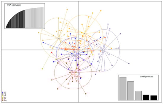 - Miller, J.M.; Cullingham, C.I.; Peery, R.M. The influence of a priori grouping on inference of genetic clusters: Simulation study and literature review of the DAPC method. Heredity 2020, 125, 269–280. [Google Scholar] [CrossRef]