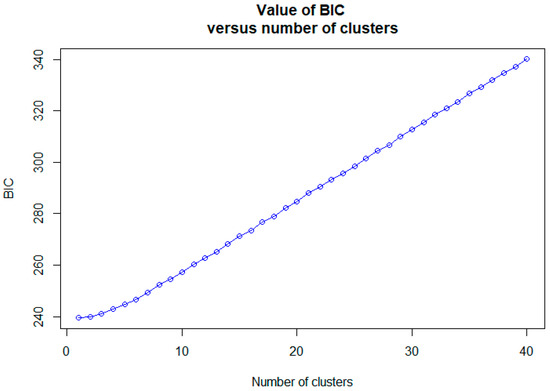 Value of BIC versus number of clusters. The BIC value closest to 0 indicates the best fit for the cluster.