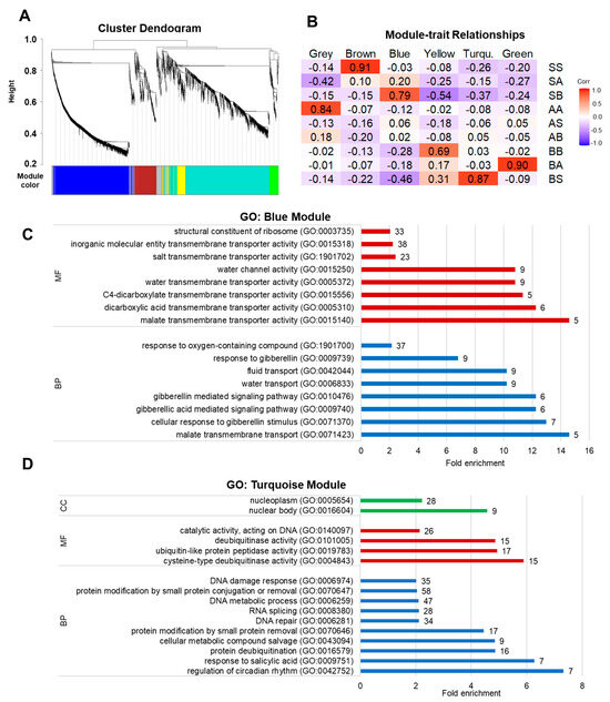 Co-expression network of all differentially expressed genes. (A) Dendrogram of gene clustering and modules of coexpressed genes with similar expression patterns clustered by color. (B) Correlations (p-values) between treatment and modules. Positive and negative correlations are indicated by red and blue coloration, respectively. (C,D) Enrichments in gene ontology (GO) terms for biological processes (BP), molecular function (MF), and cellular components (CC) for the blue (C) and turquoise (D) modules. Fold change enrichment and number of genes in each GO term are indicated.