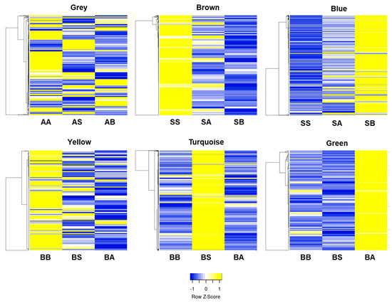 Heatmaps of the genes in the co-expression modules in the soil group where the color module was highly correlated with at least one treatment. Gene expression was indicated by the z-score with blue and yellow shades indicating up- and down-regulated genes, respectively.