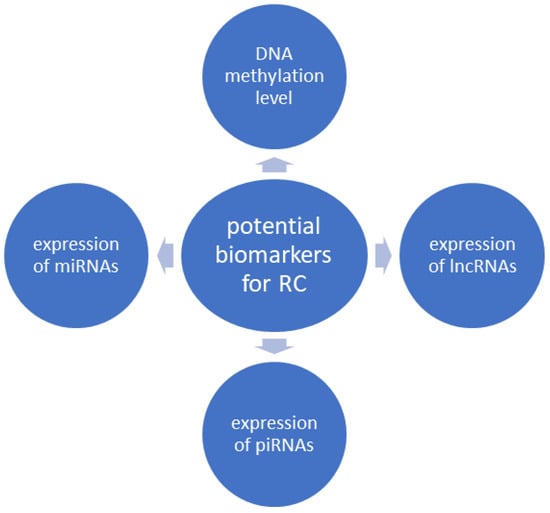 Most important potential liquid biopsy biomarkers for renal cancer. miRNAs—microRNAs, lncRNAs—long noncoding RNAs, piRNAs—P-element-induced wimpy testis-interacting RNAs, RC—renal cancer.