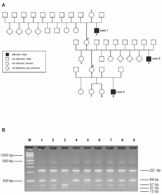 Pedigree of the Fleckvieh cattle family with the three affected male calves (cases 1–3) and the corresponding results from the PCR-RFLP analysis for the EDA:g.85716041G>A (ss2019497443, rs1114816375) variant. (A) Pedigree of the Fleckvieh cattle family used in this study. Samples from the numbered animals were available for the molecular genetic analyses. Phenotypic data from the other animals are based on veterinary examinations and the farmer’s records. (B) Agarose gel electrophoresis with the results of the PCR-RFLP analysis for the rs1114816375 variant. The lane designated M is a 100-bp ladder marker. The affected male animals (numbered 4, 5 and 9 on the agarose gel) had only the mutant allele with fragment lengths of 221, 94 and 13 base pairs. The maternal half-sister of case 2 (numbered 3 on the agarose gel) had only the wild-type allele with 221, 57, 37 and 13 base pair fragments. Dams of case 1 (numbered 1 on the agarose gel), case 2 (numbered 2 on the agarose gel), and case 3 (numbered 6 on the agarose gel) as well as two maternal half-siblings (numbered 7 and 8 on the agarose gel) of case 3 have both mutant and wild-type alleles, indicating that they are heterozygous.
