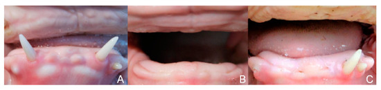 Development of incisors and canines of the three affected calves, each at the age of seven months, with different expressivity of the tooth phenotypes. (A) Two malformed and conical teeth with a length of 1.3 cm were visible protruding from the gums of case 1. At the age of seven months, one canine broke through the gums on the left side and the second canine was covered by a gum cap. (B) No incisors or canines developed in case 2 throughout its life. (C) At the age of 7 months, the canines broke through the gums on both sides. The right-sided canine stayed short. The development stage of the canines resembled those of case 1.