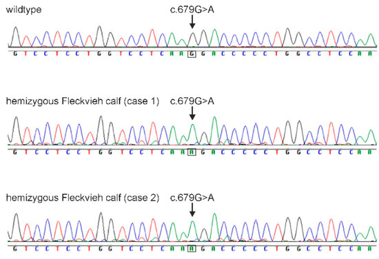Validation of the EDA-associated mutation using Sanger sequence analysis (chromatogram) of exon 4 from a wildtype Fleckvieh and two XHED-affected male Fleckvieh calves (cases 1 and 2). The arrow indicates the position of the c.679G>A mutation within the cDNA sequence of EDA.
