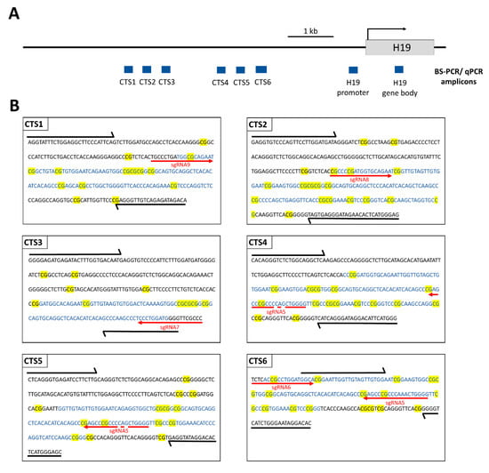 Scheme illustrating the ICR1 and the H19 gene on chromosome 11p15.5 (chr11: 1,996,336–2,003,171, GRCh38/hg38). (A) PCR amplicons used for BS-seq and qPCR (for MBD2-Pulldown and CTCF-ChIP) within the CTCF target sites (CTS) are depicted in blue rectangles. (B) The sequences of the PCR amplicons are shown for CTS1-6. The sequences of the HEK293 cell line were obtained from http://hek293genome.org/v2/. Black arrows show the BS-PCR primer binding sites. The qPCR amplicons are represented by blue letters. CpG sites are highlighted in yellow. The respective sgRNA binding sites are shown by red arrows. The primer sequences and genomic positions of the BS-seq amplicons are provided in Supplementary Table S2.