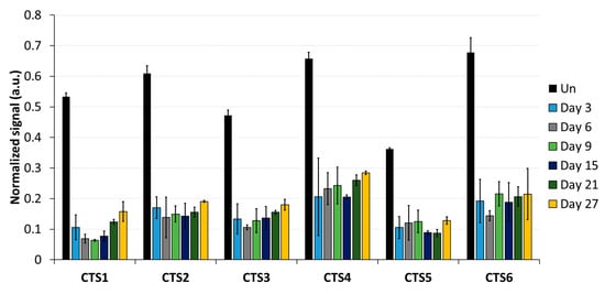 DNA methylation analysis at the CTCF target site (CTS) regions analyzed by MBD2-pulldown. MBD2-pulldown qPCR signals were normalized to the input DNA and to the signal obtained at the fully methylated promoter of SLC6A3. Data are shown for CTS1-6 in untreated (Un) cells, as well as for different time points (day 3, day 6, day 9, day 15, day 21, and day 27) after transfection with the epigenome editing system. Data are represented as the mean of three independent biological replicates ± standard deviation (SD) for Un and days 3, 6, and 9. For days 15, 21, and 27, data are shown as the mean of two independent biological replicates ± SD. a.u. = arbitrary unit.