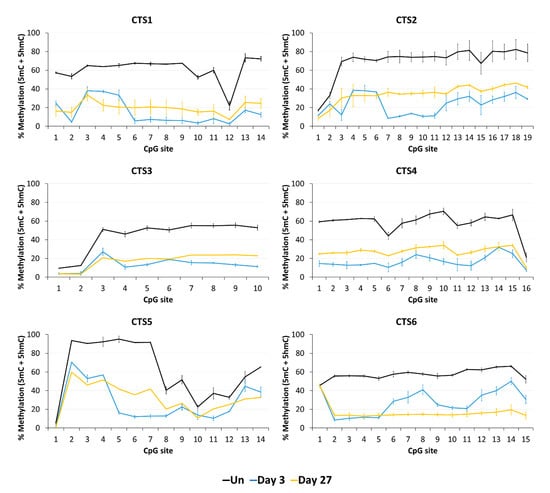DNA methylation at the CTCF target site (CTS) regions determined by BS-seq. The level of DNA methylation, which in standard BS-seq includes 5mC plus 5hmC, is shown at each CpG site of the respective BS-PCR amplicons. The graphs show the DNA methylation of untreated HEK293 cells (Un, black line) and of cells on day 3 (blue line) and on day 27 (yellow line) after transfection with the EpiEditor. Data are represented as the mean of two independent biological replicates ± SD. For CTS3 and CTS5 on day 27, only one biological replicate is shown.