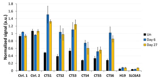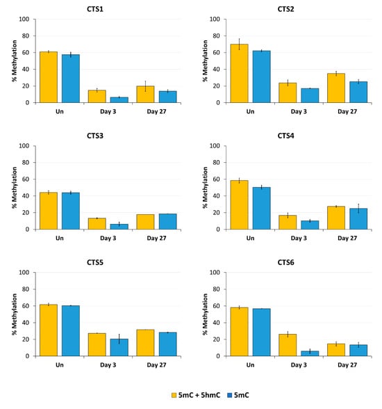 Our data clearly illustrate (Figure 5) that most CTSs showed an increase in 5hmC levels compared to the untreated cells 3 days after transfection, which reflects the catalytic activity of TET1CD. This effect was reduced 27 days after transfection, which was expected because there is no established mechanism for the maintenance of 5hmC. The analysis of the corrected 5mC levels deduced from this experiment confirmed the previous findings as the overall 5hmC levels were relatively low. Three days after transfection, 5mC levels were reduced between 66% at CTS5 and 90% at CTS1 and CTS6 compared to the untreated cells. The strongest persistence of the demethylated state was seen at CTS1 and CTS6. After 27 days, these CTSs were still 76% demethylated compared to the untreated cells.