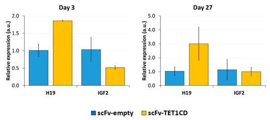 Lastly, we analyzed whether DNA demethylation, as well CTCF binding to the unmethylated CTSs, affected the expression of the H19 and IGF2 genes by RT-qPCR (Figure 7). Since half of the alleles are expected to express H19 in the initial state, a complete demethylation could lead to a 2-fold increase in expression. On day 3 after transfection with dCas9-SunTag-scFv-TET1CD and the sgRNAs, a 1.8-fold increase in the relative H19 expression was observed compared to the cells transfected with dCas9-SunTag-scFv-empty and the sgRNAs, which suggests an almost complete reprogramming of H19 expression at this locus. This increase remained stable until day 27. Contrarily, the relative expression of IGF2 was 2-fold reduced. However, after 27 days, the relative IGF2 expression returned to a similar level to that of the control transfected cells, indicating that the silencing of IGF2 was not stable.