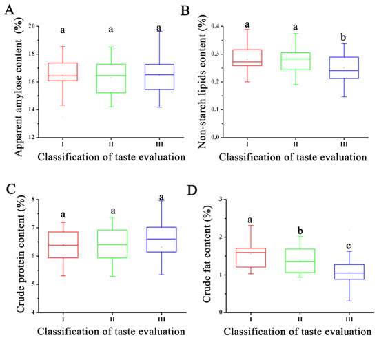 The difference analysis of the nutritional quality and eating quality of rice variety. (A) The apparent amylose content of rice with different taste quality. (B) The non-starch lipids content of rice with different taste quality. (C) The crude protein content of rice with different taste quality. (D) The crude fat content of rice with different taste quality. Note: The least significant difference (LSD) method is used to compare the means between different recombinant inbred lines with different taste evaluation. Different letters within the same column indicate significance at 0.05 probability level.