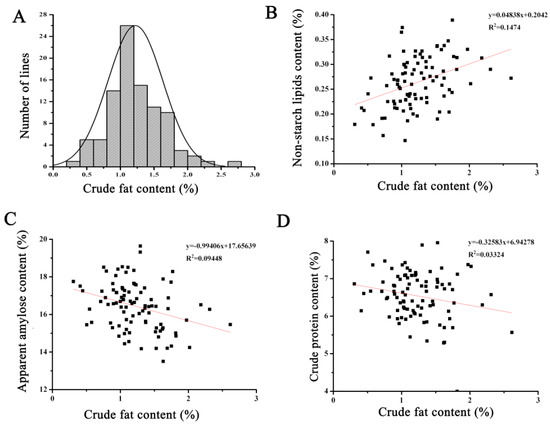 The correlation analysis of crude fat content and other nutritional quality in recombinant inbred lines. (A) Normal distribution of crude fat content in recombinant inbred lines. (B) The correlation analysis of crude fat content and non-starch lipids content. (C) The correlation analysis of crude fat content and apparent amylase content. (D) The correlation analysis of crude fat content and crude protein content.