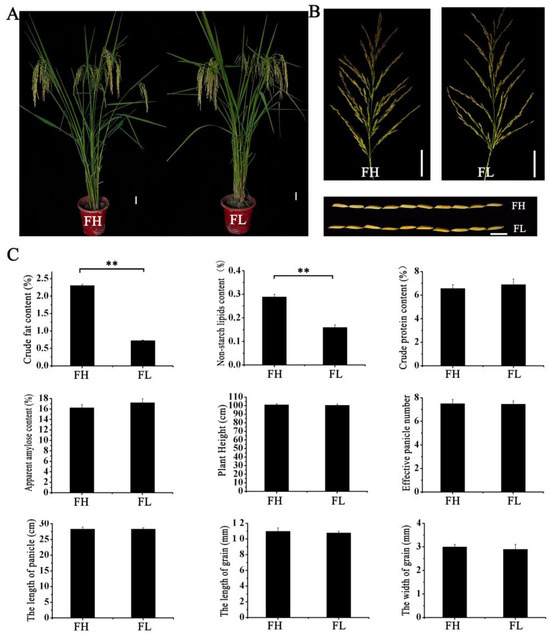 The agronomic and rice quality traits of FH and FL. (A) Plant type. (B) Spikelet type and grain type. (C) Main agronomic traits and rice quality traits. Note: (1) The two-sided t-test was used to test the difference significance between FH and FL on agronomic and rice quality traits. ** indicates significance at the 0.01 probability level.