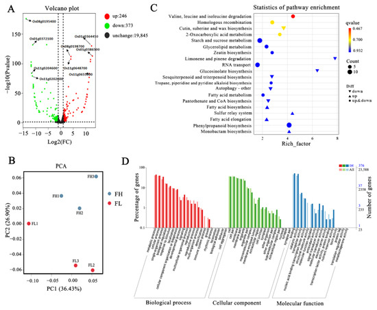 Transcriptome analysis of rice quality changes between FH and FL materials. (A) Volcano map of differentially expressed genes. (B) PCA score plot of two grains in FH and FL lines. (C) Bubble chart of KEGG enrichment analysis of differently expressed genes. (D) GO enrichment and GO terms of RNA-seq data.