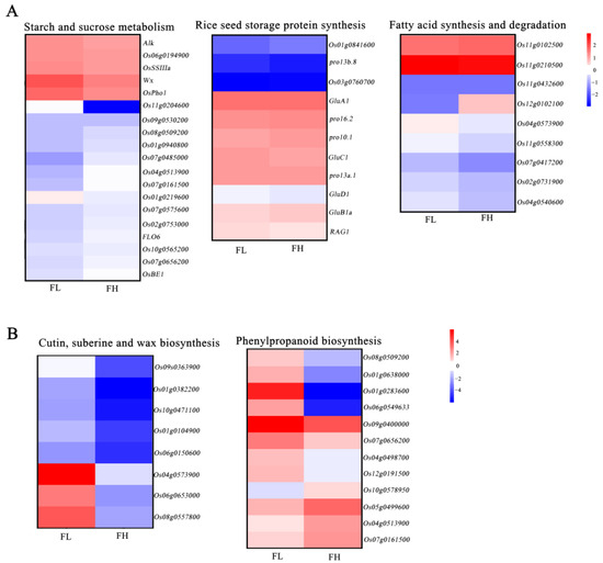 Analysis of genes differentially expressed in FH material compared with FL material. (A) Heat map of expression change of genes selected in the starch and sucrose, storage protein, and fatty acid metabolism. (B) Heat map of expression change of genes selected in the DEGs. The color in each frame represents the level of expression change based on the log2 fold.