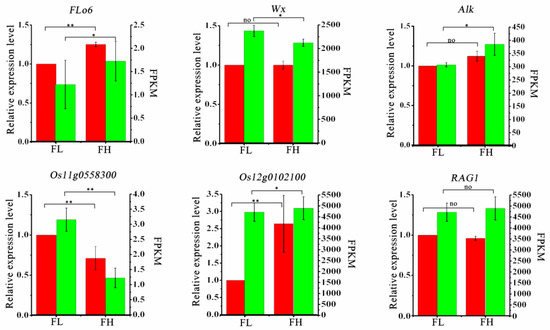 qRT-PCR analysis of differently expressed genes of rice quality. Note: The data in the red bars of the graphs are the mean ± standard deviation of gene expression from three biological replicates, with actin used as an internal reference for the homogenization calculations, in which the gene expression of the FL material was normalized to 1, and the vertical coordinates are on the left. The data in the green bar graph are FRKM values from transcriptome analysis, with vertical coordinates on the right. The two-sided t-test was used to test the difference significance in gene expression or transcriptome FRKM values between the two recombinant inbred lines, FH and FL, and “*” indicated the significance at 0.05 probability level (p < 0.05), “**” indicated the significance at 0.01 probability level (p < 0.01), and “no” indicated that the difference was not significant.