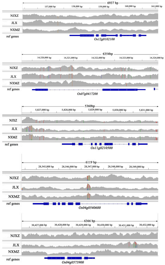 The haplotype of five fatty anabolism-related genes among three rice cultivars. The special color in the bam file showed the variation positions in target genes in comparison to reference genome.