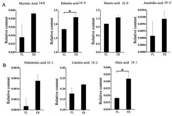 Comparison of the relative amount of main fatty acids in FH and FL of rice. (A) The relative amount of four saturated fatty acid in FH and FL. (B) The relative amount of three unsaturated fatty acid in FH and FL. Note: The two-sided t-test was used to test the difference significance between FH and FL on the main fatty acids. * indicated the significance at 0.05 probability level.