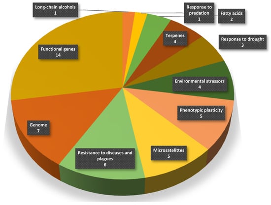 Microsatellites, also known as simple sequence repeats (SSRs), are short repeated DNA sequences scattered throughout the genome. Studying microsatellites in stone pine can provide valuable information about the genetic diversity, population structure, evolutionary history, and breeding strategies of this species. They are mainly used in quantitative genetic studies from stone pine. Their importance seems to be highlighted by the investment in this subject, proving to be the most studied among these papers found for this species. Table 2 summarizes the findings from stone pine’s microsatellite studies.