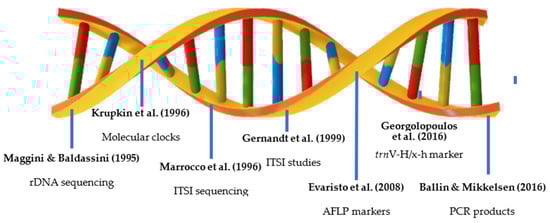 Stone pine genome studies started in 1995 with a paper on phage cloning, plasmid subcloning, and partial nucleotide sequencing of the P. pinea rDNA (ribosomal DNA) by Maggini and Baldassini (1995) [21]. It showed that the ribosomal band patterns observed are clearly characteristic of the species. This first attempt to study stone pine genetics was of great importance as it provided a way to genetically prove the phylogenetic relationships of this species with closely related taxa. Not long after, Krupkin et al. (1996) [22] showed that Mediterranean species were closely allied with members of sect. Pinea, which appeared to be polyphyletic. Krupkin et al. (1996) [22] worked with molecular clocks calibrated using two hard pine fossil observations, which introduced the integration of molecular clocks and fossil records in phylogenetics studies for this species. Marrocco et al. (1996) [23] reported the sequencing of the nucleotide sequence of the first internal transcribed spacer (ITSI) belonging to different ribosomal RNA genes from P. pinea. The nucleotide comparison of these regions did not show an appreciable sequence homology, which indicated that previous approaches were more effective for species identification. Gernandt et al. (1999) [24] worked with the nucleotide sequence from the ITS region of stone pine from Marrocco et al. (1996) [23]. This allowed for a comparative study of the same region from different species of the Pinaceae family. These species belong to the Larix and Pseudotsuga genera. This study identified dissimilarities of the obtained sequences when compared to the stone pine sequence. This analysis brought to light the phylogenetic relationships of the three genera within the Pinaceae family.