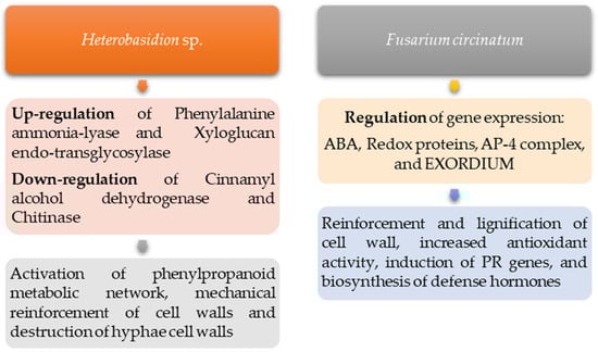 Pepori et al. (2018) [32] reported that several defense-related genes and terpenes were highly induced after infection by the two different Heterobasidion species (a common phytoparasitic fungal genus). An up-regulation was detected for phenylalanine ammonia-lyase (the initial key step in the phenylpropanoid metabolic network) and xyloglucan endo-transglycosylase (involved in the mechanical reinforcement of cell walls under pathogen attack). Alternatively, cinnamyl alcohol dehydrogenase (important for lignin biosynthesis) and chitinase (involved in the destruction of hyphae cell walls) showed a down-regulation for both pathogens. The up-regulation of transcripts as well as the accumulation of terpenoids revealed that a systemic signal is inducible in stone pine by both pathogens.