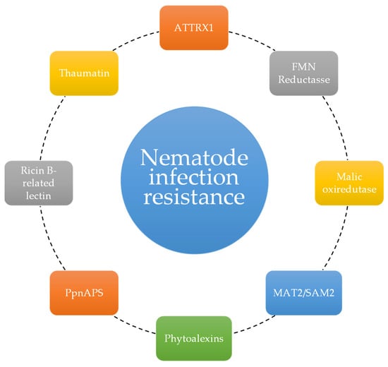 In 2011, Franco et al. [30] pinpointed the expression of Pathogenesis-related proteins 4 after inoculation with the pinewood nematode. The expression of proteins is associated with pathogen attack response mechanisms encoded in the genes ATTRX1 and MAT2/SAM2. These proteins are mainly associated with osmotic stress, oxireductive processes, and cell death, demonstrating that these processes may be integrated in the tree’s ability to survive nematode infection. The comparative transcriptome analysis by Santos et al. (2012) [52] showed that stone pines infested with the pinewood nematode highly expressed ricin B-related lectin, FMN reductase, and malic oxidoreductase. Their differential expression is a common mechanism in the general defense against a multitude of plant pathogens. Phytoalexins, that show nematocidal activity, were also differentially expressed after inoculation. The pinewood-nematode-related thaumatin, a disease resistance protein, was also detected in this work. This protein is especially interesting as it is required at the transcriptional level in the reaction to stress responses and environmental changes. To understand the role of terpenes in plant–nematode interactions, Trindade et al. (2016) [31] studied the α-pinene synthase gene expression in in vitro axenic shoot cultures of stone pine. The semi-quantitative PCRs revealed that after infection, there was a clear response by the tree, corresponding to an increased expression of Pinus pinea α-pinene synthase (PpnAPS). Despite the promising result, it was not possible to determine to what extent the differences in gene expression level are related to pathogen resistance.